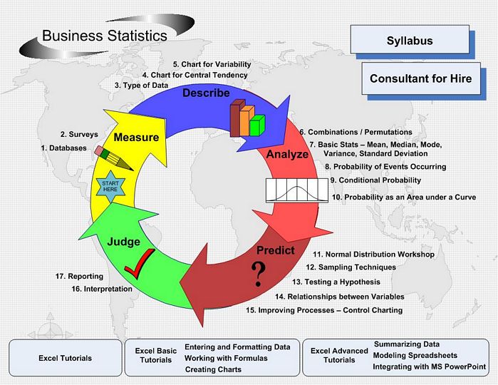 click here for Syllabus click here for Consulting Exercises click here for Simple Linear Regression click here for Hypothesis Testing click here for Sampling Techniques click here for Normal Distributions click here for Probability Under Curve click here for Conditional Probability click here for Probability of Events Click here for Basic Statistics click here for Combinations and Permutations click here for Variability Charts click here for Stem and Leaf Charts click here for Types of Data click here for Surveys click here for Databases click here for Interpretation click here for Reporting click here for Control Charting click here for Excel Tutorial Summarizing click here for Excel Tutorial Modeling click here for Excel Tutorial PowerPoint Integration click here for Excel Tutorial Entering Data click here for Excel Tutorial Formulas click here for Excel Tutorial Charts click here for an Overview